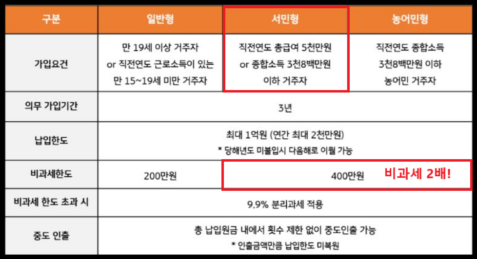 | 비과세 혜택 | 일반형은 200만 원, 서민형은 400만 원까지 세금 면제 |